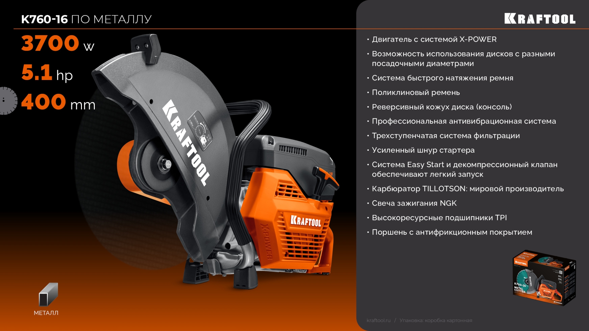 KRAFTOOL 3700 Вт, 400 мм, без диска, бензорез по металлу (рельсорез) (K760-16)